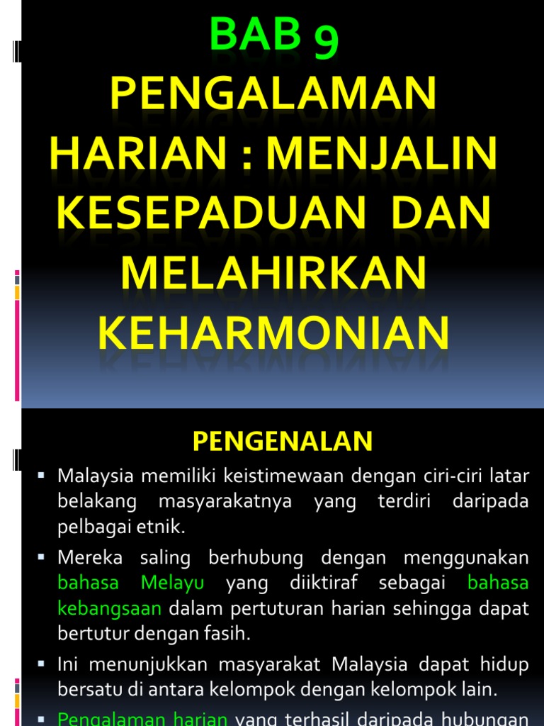 Bab 9 Bab 9 Pengalaman Harian Menjalin Kesepaduan Dan Melahirkan Keharmonian Pengenalan Masyarakat Malaysia Terdiri Daripada Pelbagai Etnik Mereka