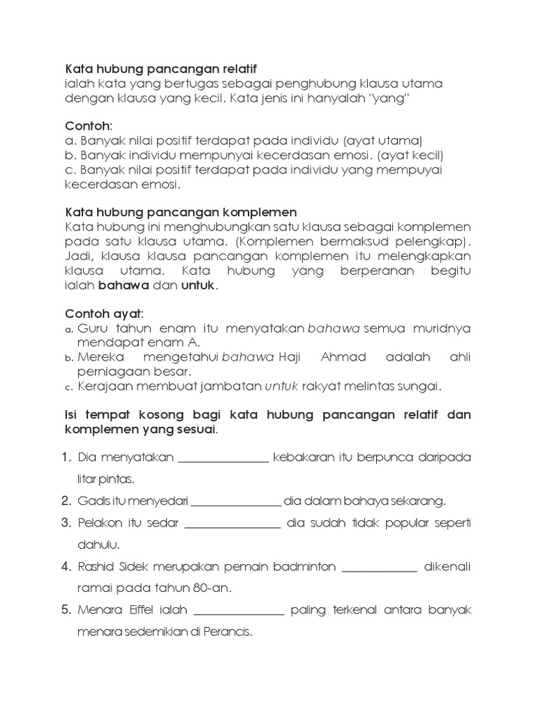 Kata Hubung Pancangan Relatif Dan Komplmeen Nota Dan Latihan Docx