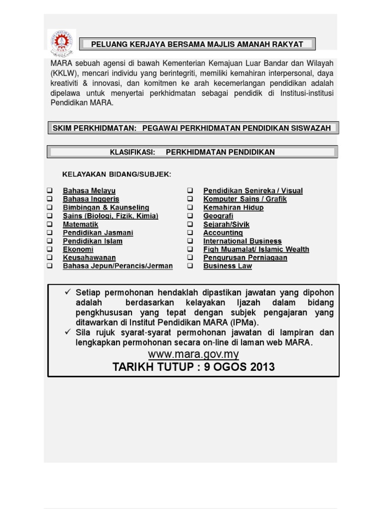 Jawatan Kosong Di Majlis Amanah Rakyat Mara Pegawai Perkhidmatan Pendidikan Dg41 Pelbagai Subjek Jobcari Com Jawatan Kosong Terkini