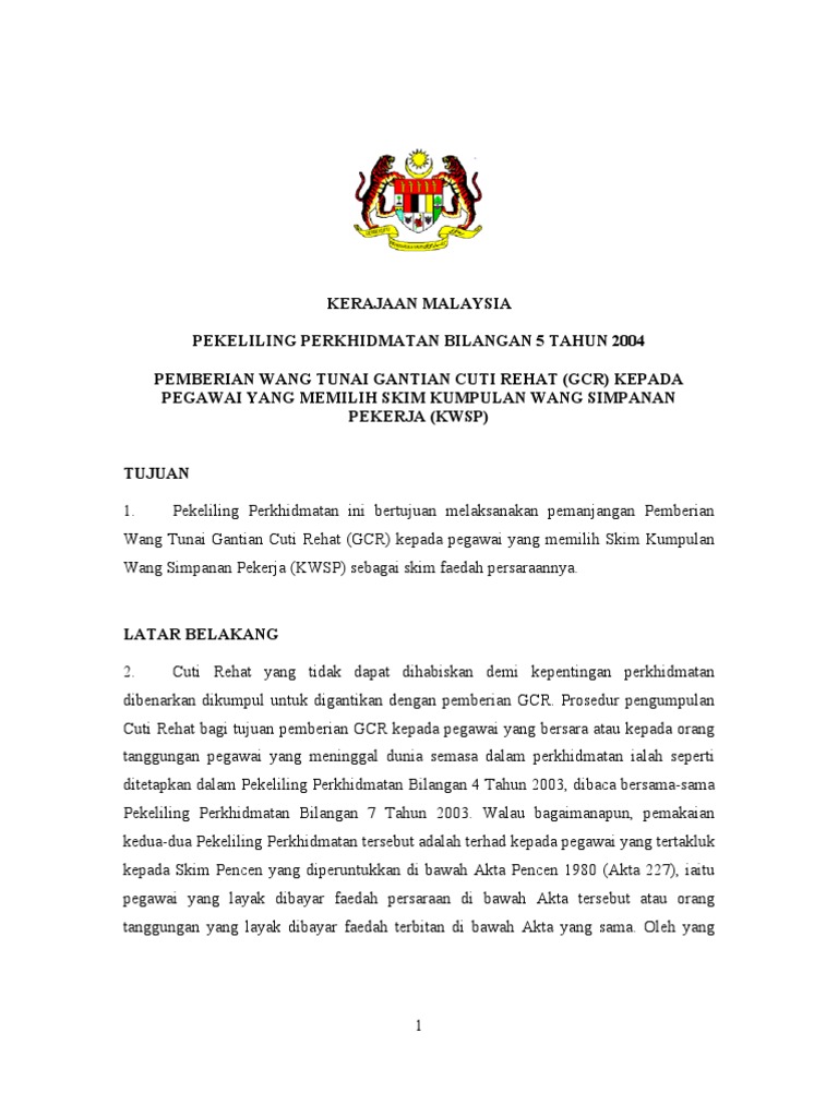 Pemberian Wang Tunai Gantian Cuti Rehat Gcr Kepada Pegawai Yang Memilih Skim Kumpulan Wang Simpanan Pekerja Kwsp 2004