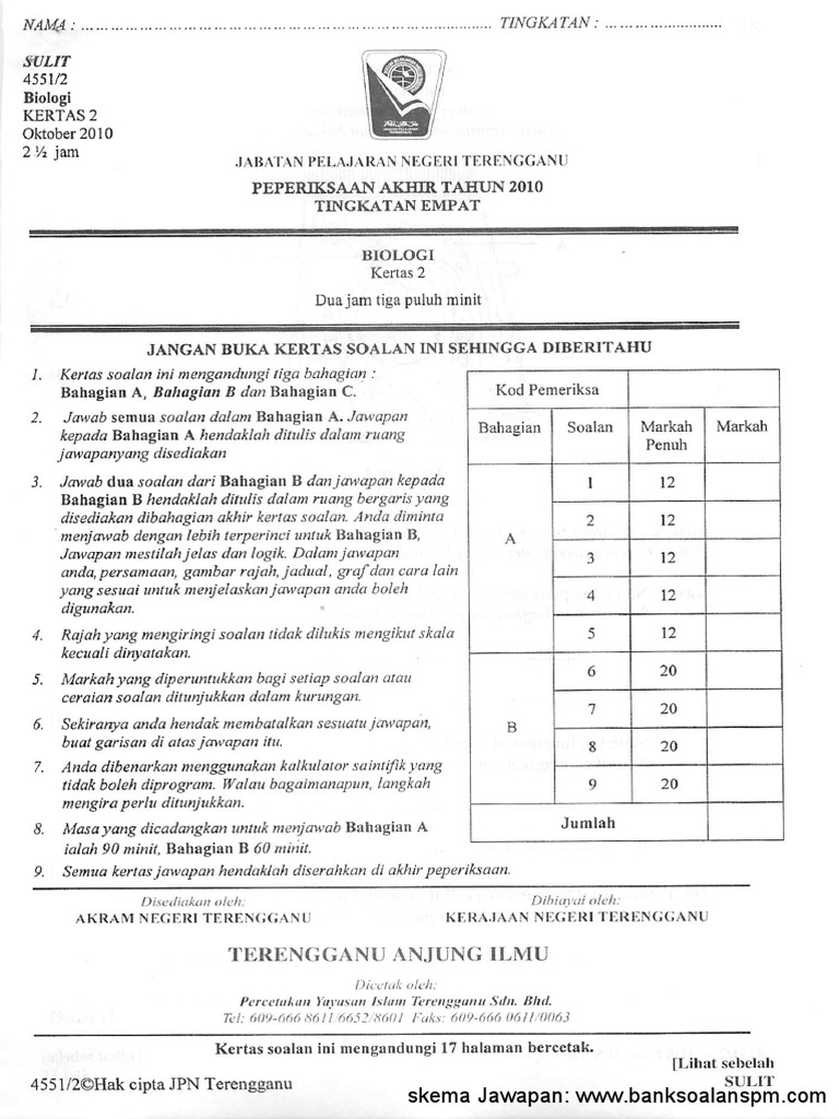 Soalan Peperiksaan Akhir Tahun Biologi Tingkatan 4 Terengganu Kecemasan W