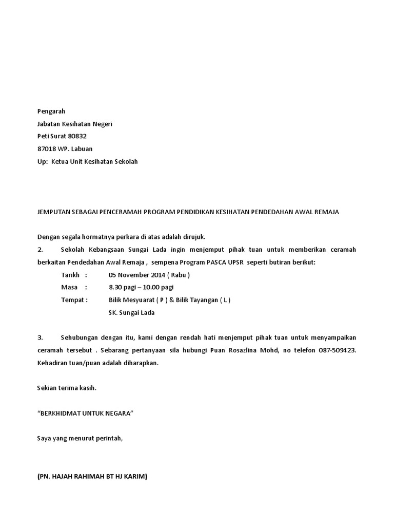 Surat Menjemput Penceramah Kesihatan Ke Sekolah