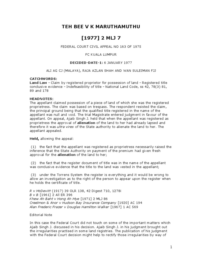 Teh Bee V K Maruthamuthu 1977 2 Mlj 7 Land Law I Studocu